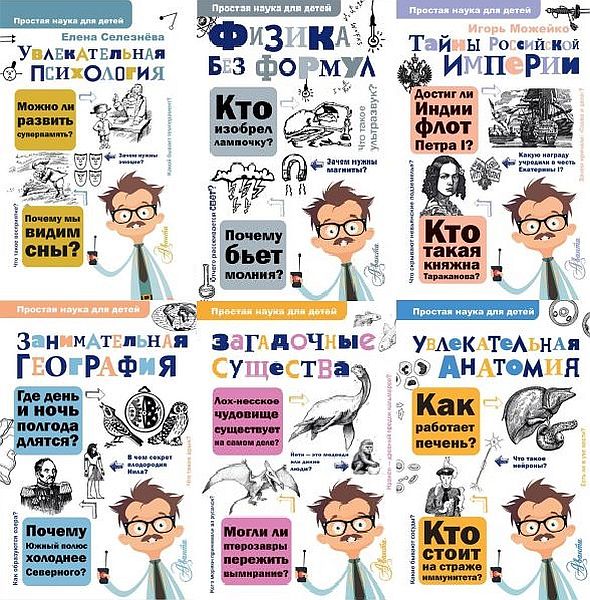 Серия книг «Простая наука для детей» для тех, кто боится формул и мудрёных объяснений, но любит решать весёлые задачки и хитрые головоломки, разгадывать загадки и делать опыты. Здесь легко, понятно и невероятно увлекательно рассказывается о чудесах в физике, химии и биологии: о вечных двигателях и путешествиях на Луну, о безмоторном летании растений, о том, как добыть огонь с помощью льда и на каких на самом деле пяти китах стоит наша замечательная планета.